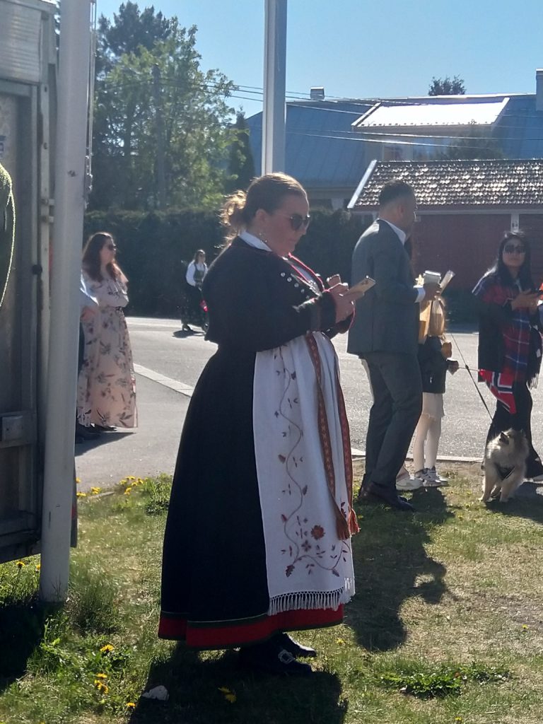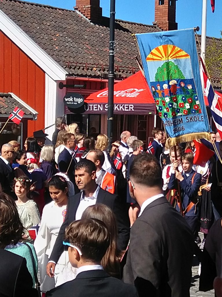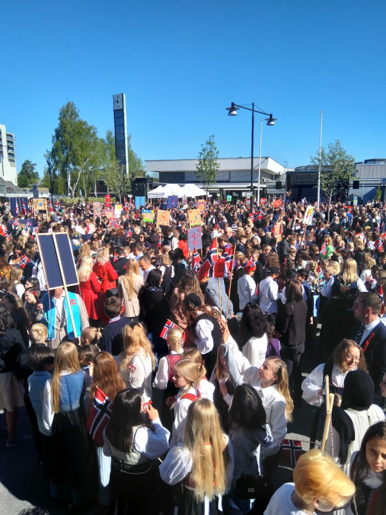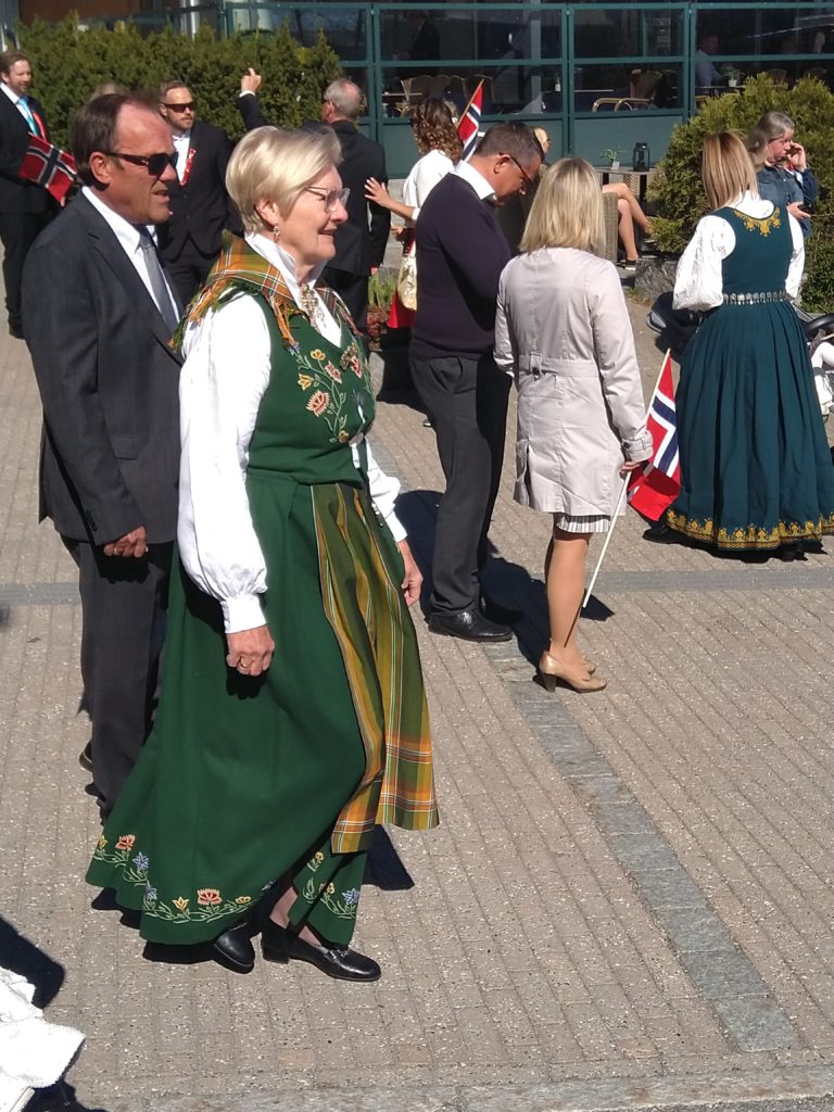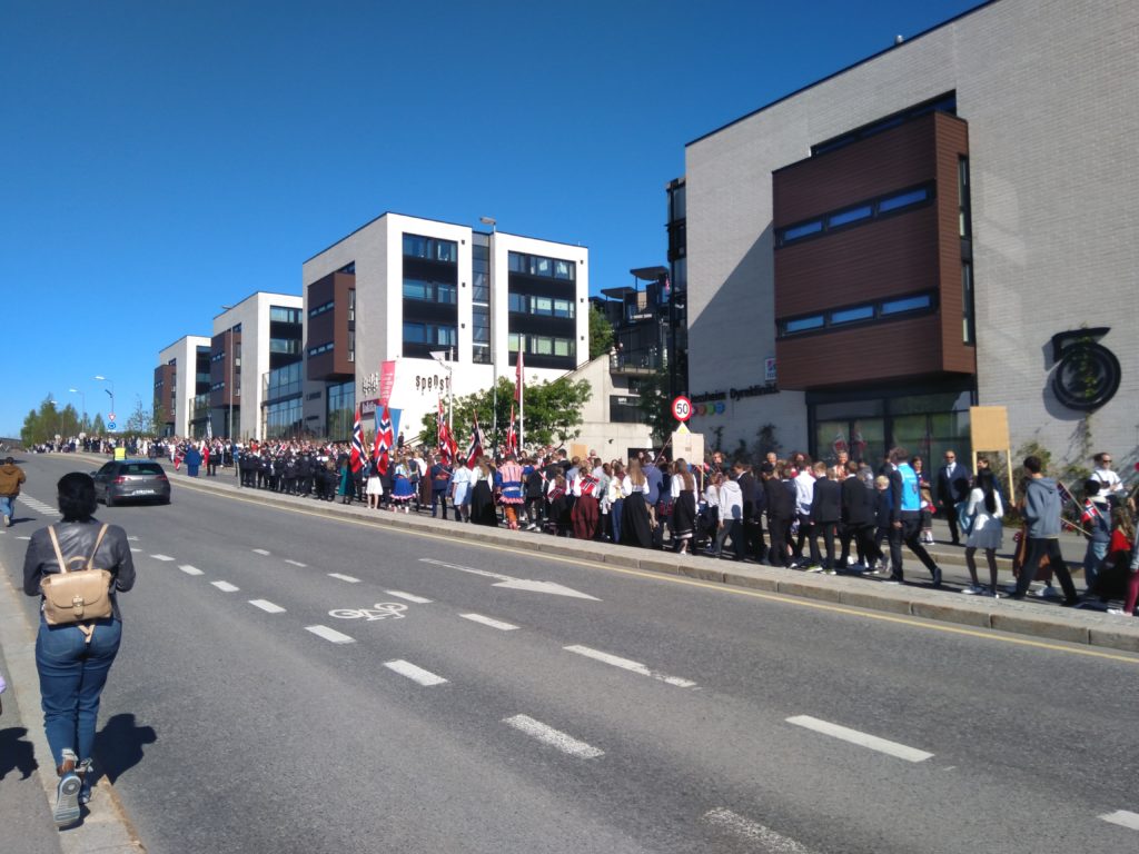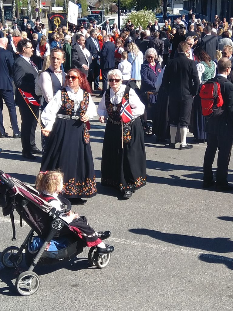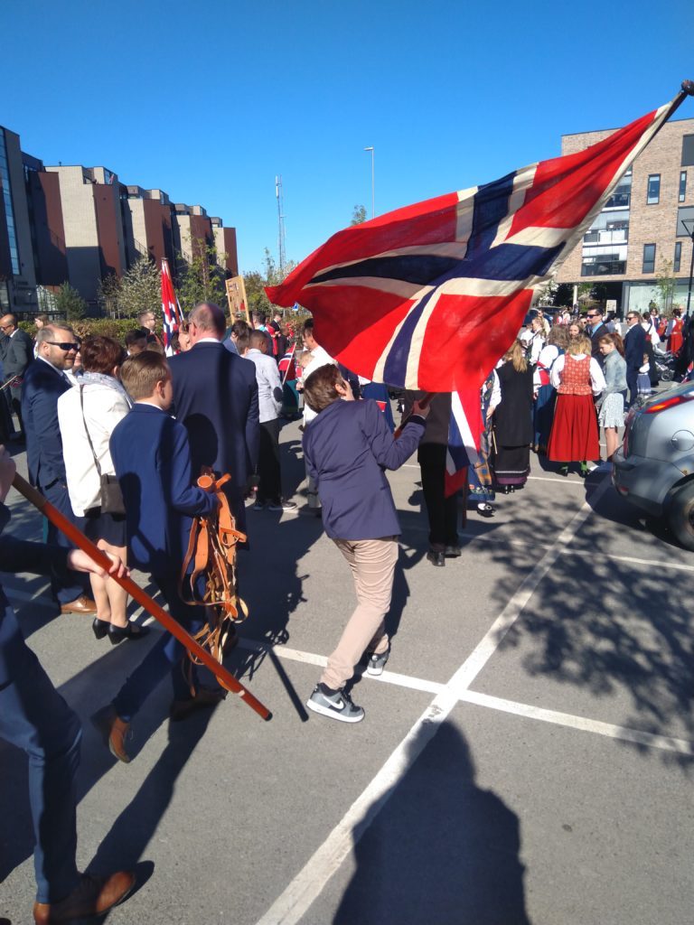 Nous voilà donc parties, Aléna et moi vers 9h pour rejoindre le lieu de rendez-vous de l’école. Finalement, Loïc et les garçons me rejoignent au départ du défilé. Nous faisions figure de touriste dans le sens où tout le monde était sur son 31 : port du costume traditionnel ou bunad, ou costard. Le défilé est parti à 9h30, à l’heure dite et en fanfare (les élèves de l’école de musique de la commune). Ils ont rejoint toutes les autre écoles de la commune puis un petit discours et re-défilé dans une rue de Jessheim. La suite des festivités avait lieu sur l’école, à 5 km de chez nous et Aléna y est allé avec sa copine espagnole pendant que nous regagnions nos pénates.