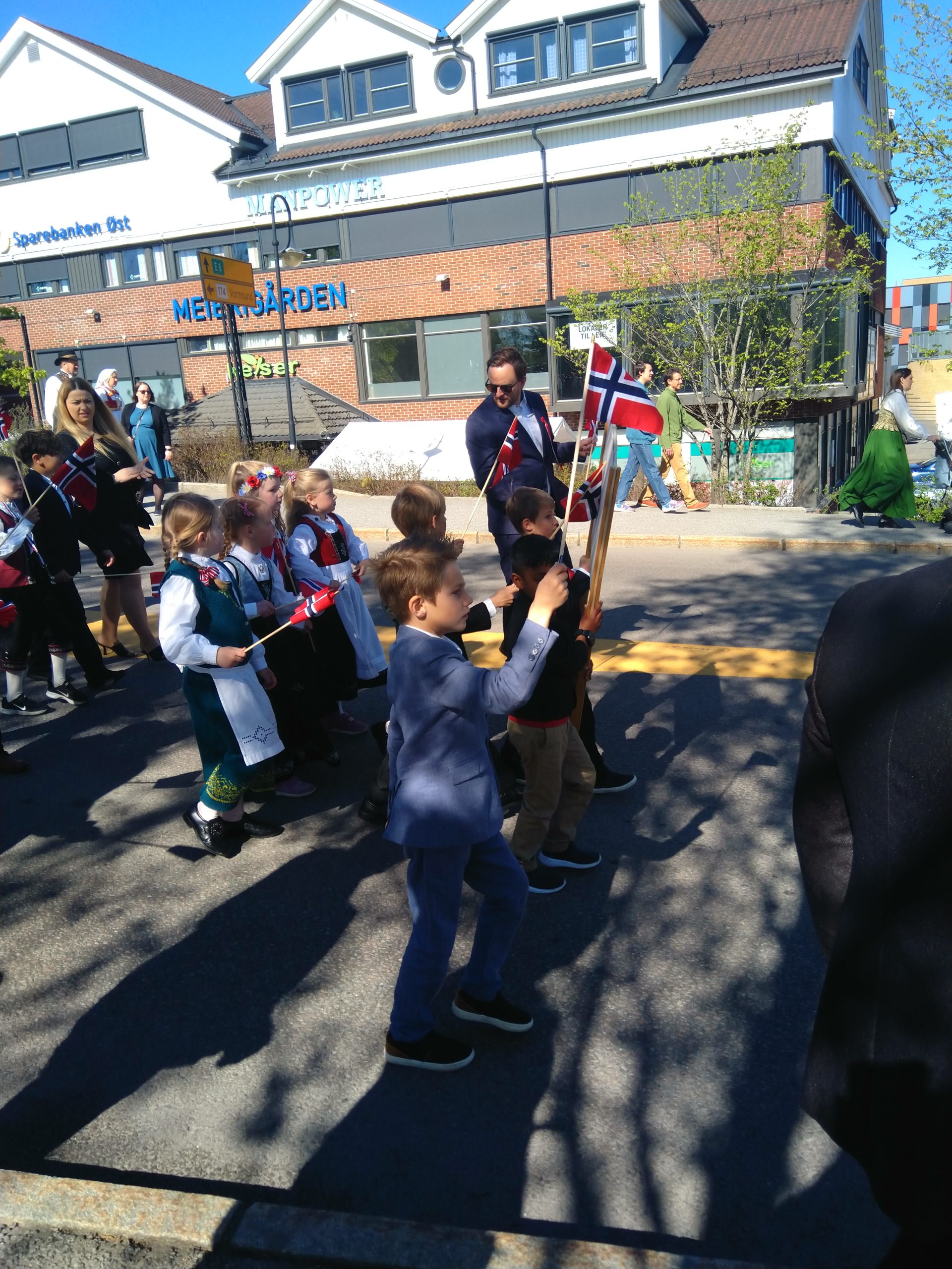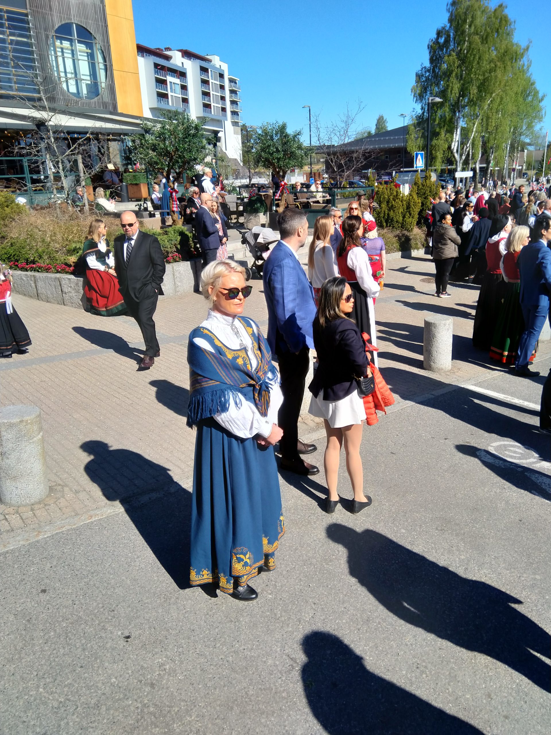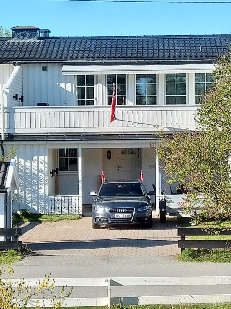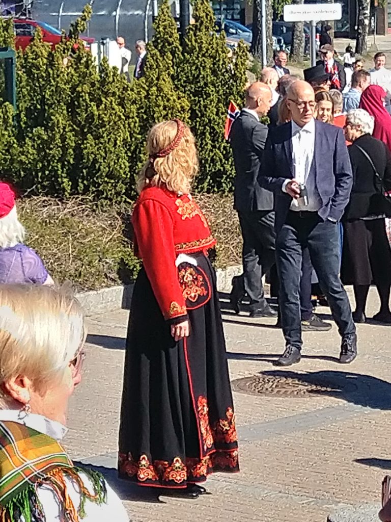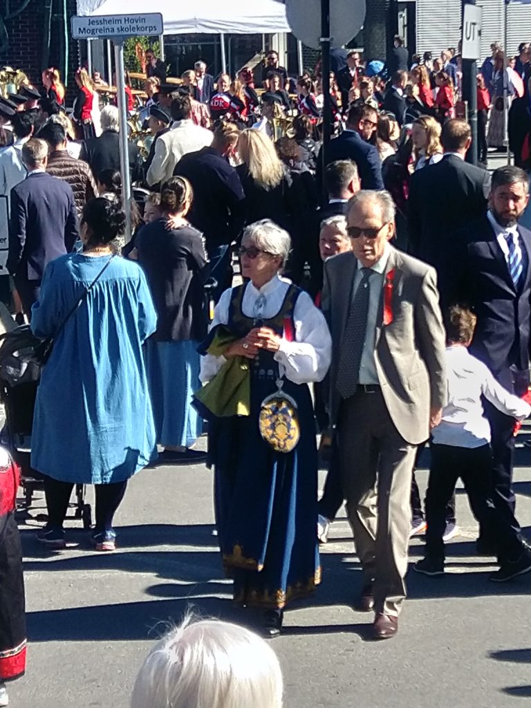 Nous voilà donc parties, Aléna et moi vers 9h pour rejoindre le lieu de rendez-vous de l’école. Finalement, Loïc et les garçons me rejoignent au départ du défilé. Nous faisions figure de touriste dans le sens où tout le monde était sur son 31 : port du costume traditionnel ou bunad, ou costard. Le défilé est parti à 9h30, à l’heure dite et en fanfare (les élèves de l’école de musique de la commune). Ils ont rejoint toutes les autre écoles de la commune puis un petit discours et re-défilé dans une rue de Jessheim. La suite des festivités avait lieu sur l’école, à 5 km de chez nous et Aléna y est allé avec sa copine espagnole pendant que nous regagnions nos pénates.