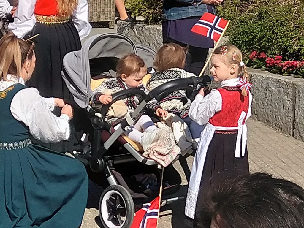 Le 17 mai est un jour férié en Norvège, car on célèbre la rédaction de la constitution du 17 mai 1814 – l’indépendance suivra en 1905. Pas de défilé de l’armée, mais des défilés d’enfants : barnetog. Pour ne rien vous cacher, j’avais envie d’y aller afin de voir de quoi il retourne, Loïc et les garçons n’étaient pas plus motivés que ca. Nous avons reçu une note d’information de l’école d’Aldric et d’Aléna nous donnant les détails des festivités. Comme le défilé avait lieu sur Jessheim, nous nous sommes dits que ce serait facile de rentrer à la maison si cela ne nous convenait pas.
