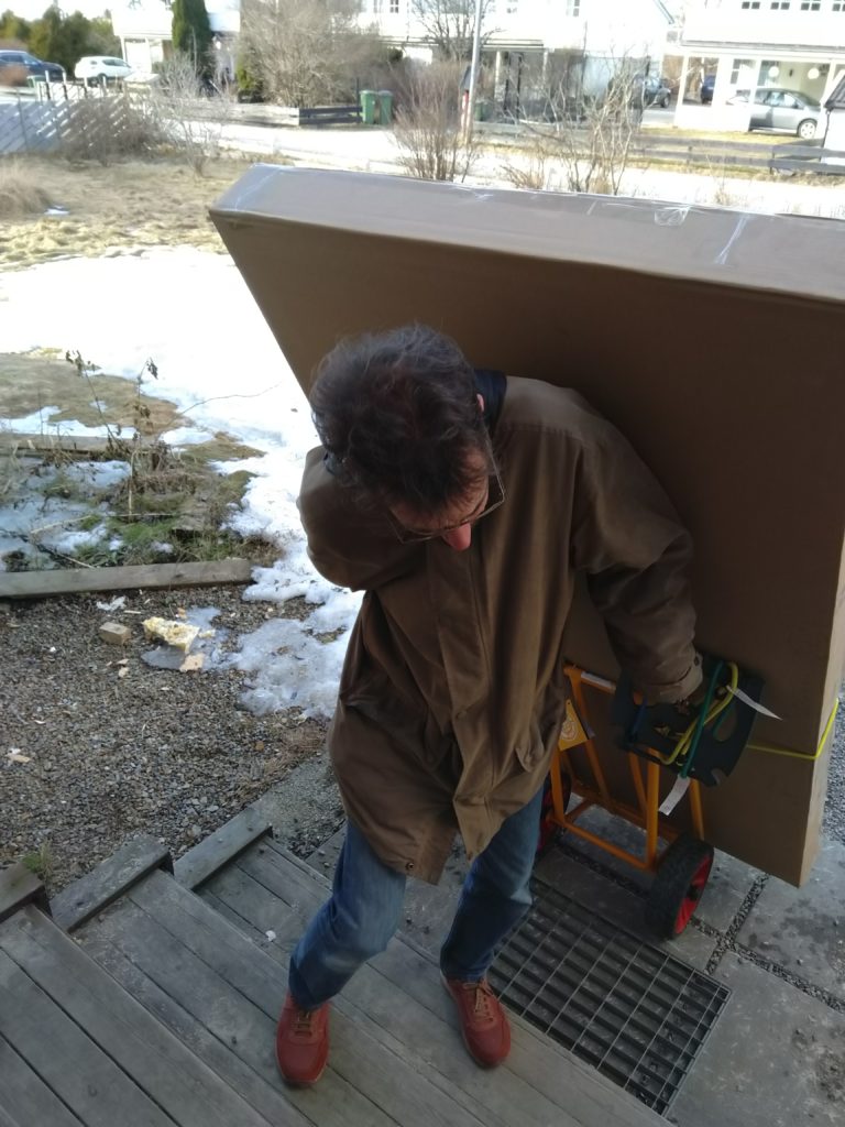 Nous avions repéré une sorte de chariot, le même que celui que peuvent tirer les enfant pour jouer. En écrivant, j’ai l’image de Winnie l’ourson qui tire son chariot avec ses pots de miel. Pas mal, mais finalement pas assez et grand, et puis il faut le monter. Nous avons donc décidé de prendre un diable, le modèle déjà monté. Nous voilà, donc avec notre diable, les tendeurs que nous avions pensé à prendre et notre table. Loïc s’est parfaitement acquit de cette tâche de « baudet ». Vous pourrez le constater et l’admirer en image ci-dessous. Du coup, hier, il est allé acheter seul les étagères pour ranger les jeux de société.