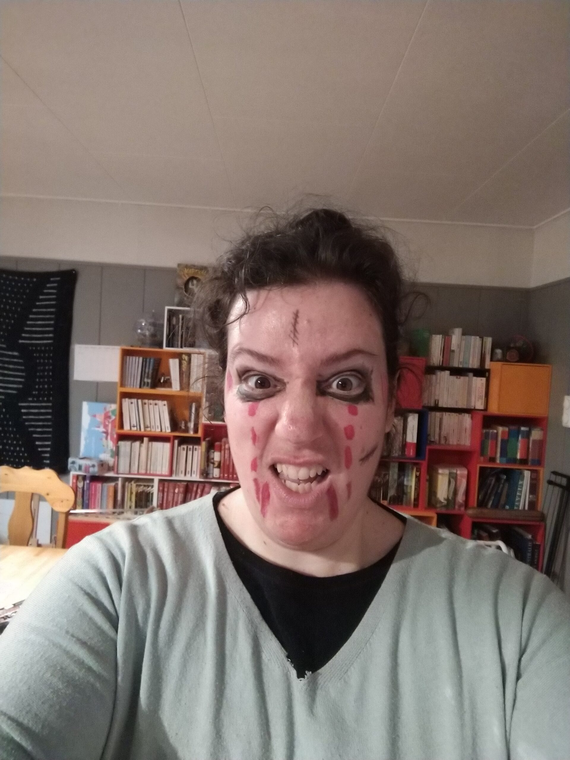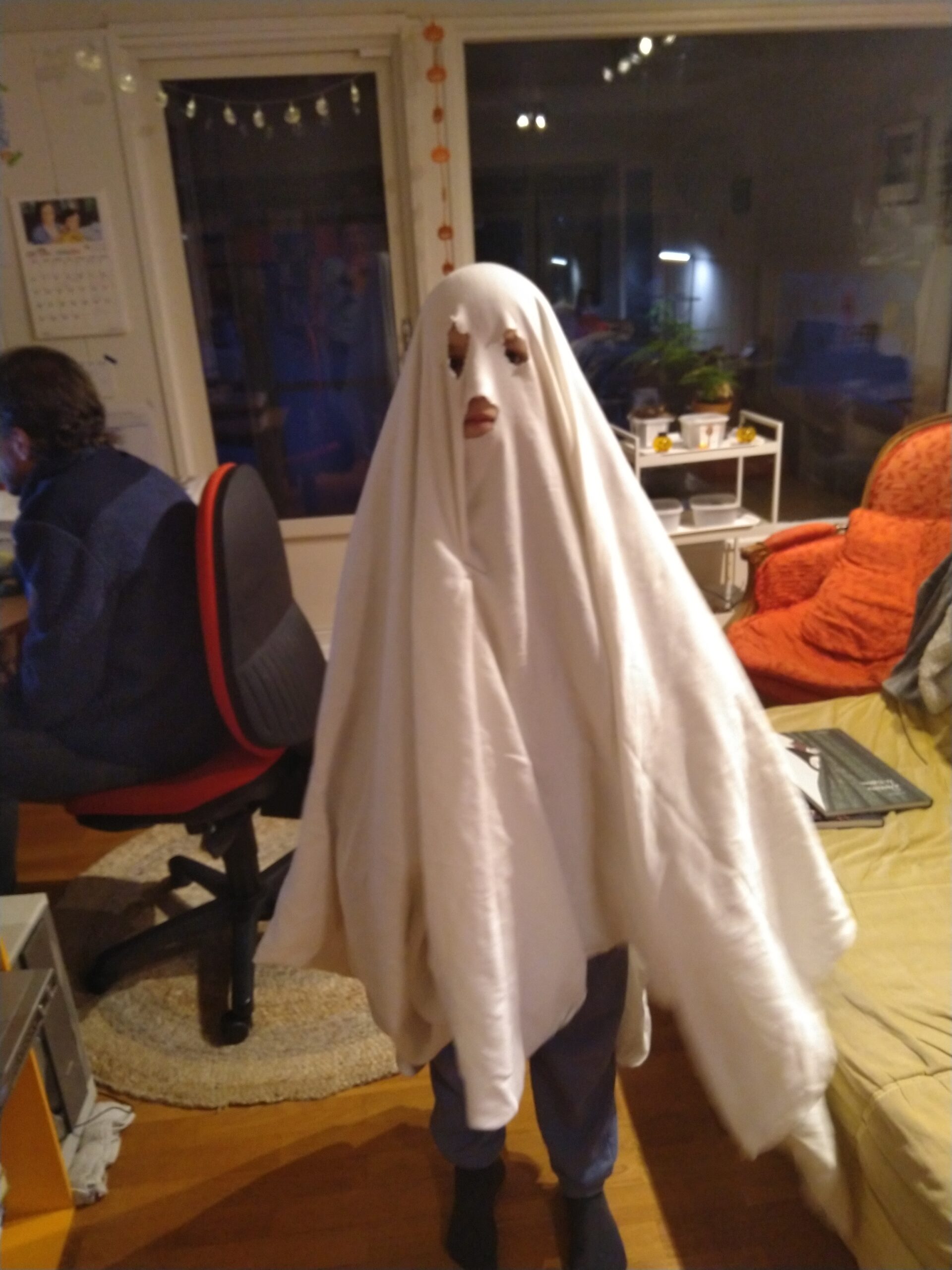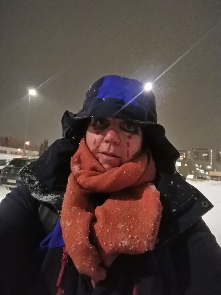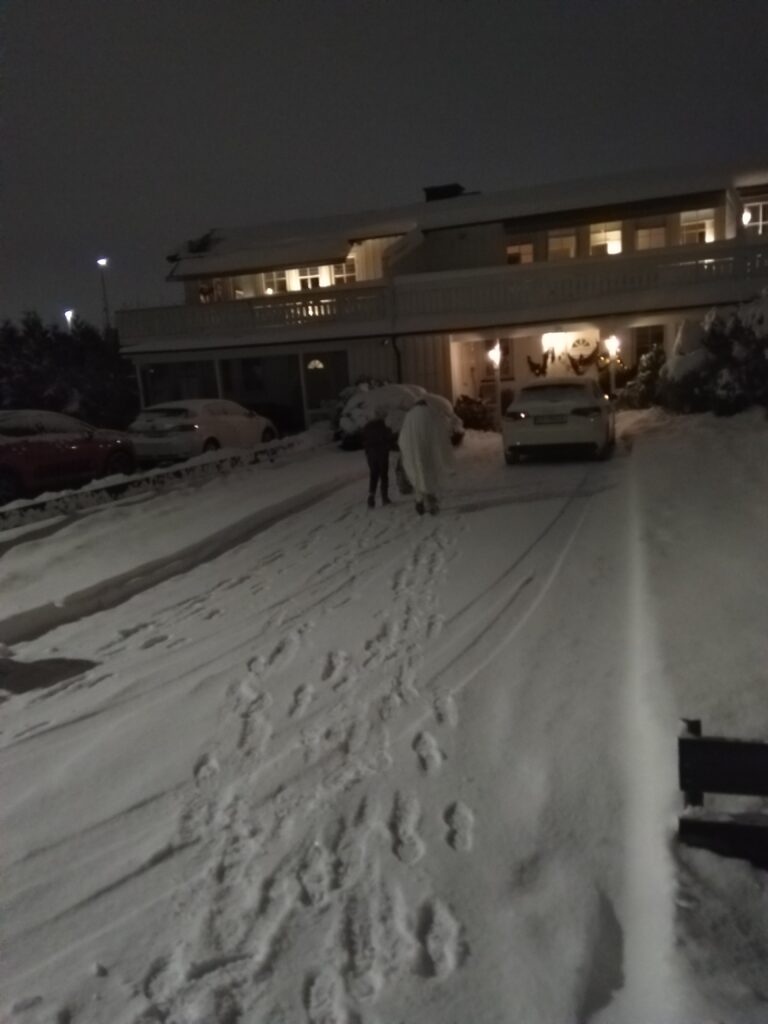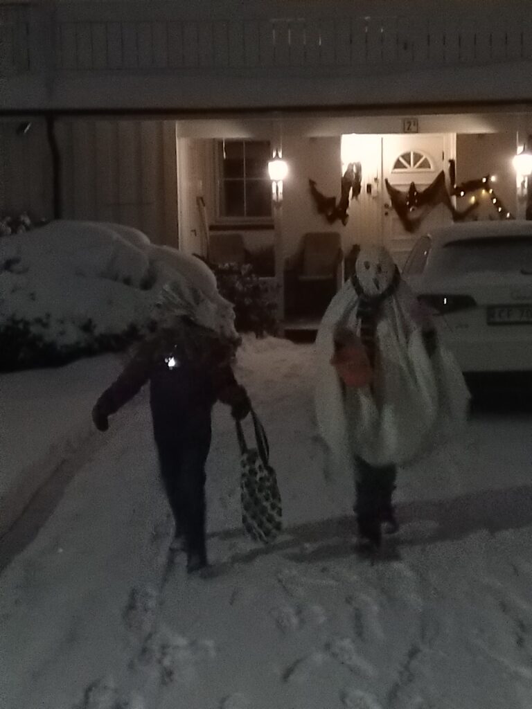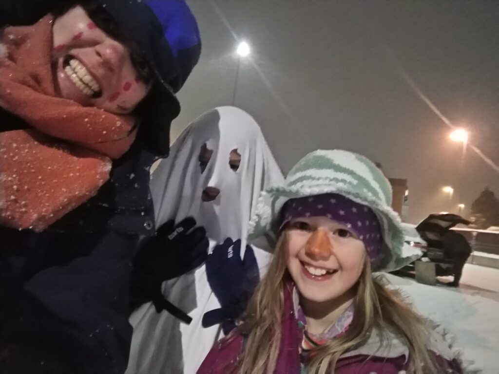 Aléna et sa copine Augusta avaient fermement décidé de faire Halloween en particulier la chasse aux bonbons. Je me suis donc dévouée pour les accompagner. Il faisait froid, il fallait marcher dans la neige etc…Un grand moment pour moi.