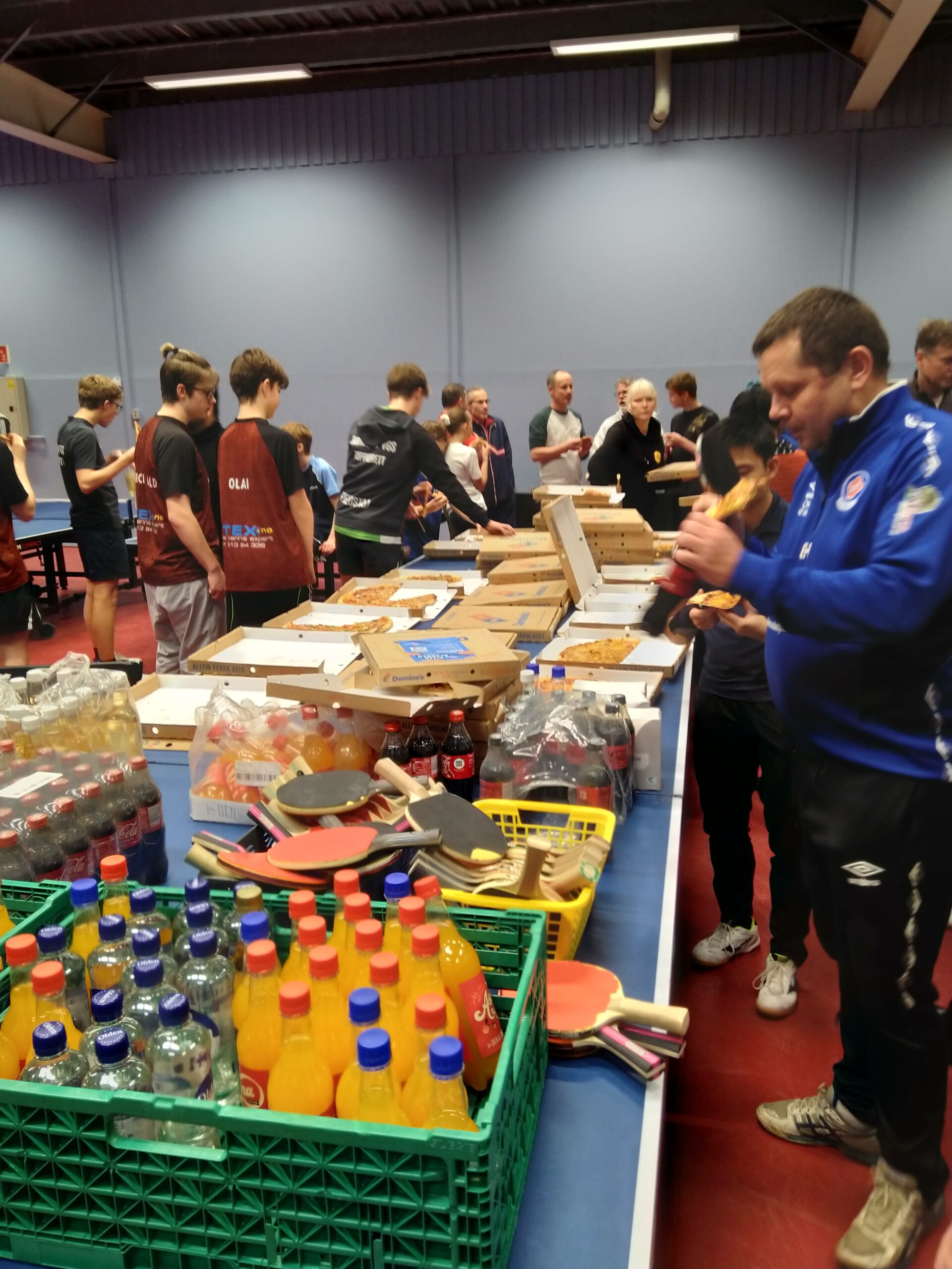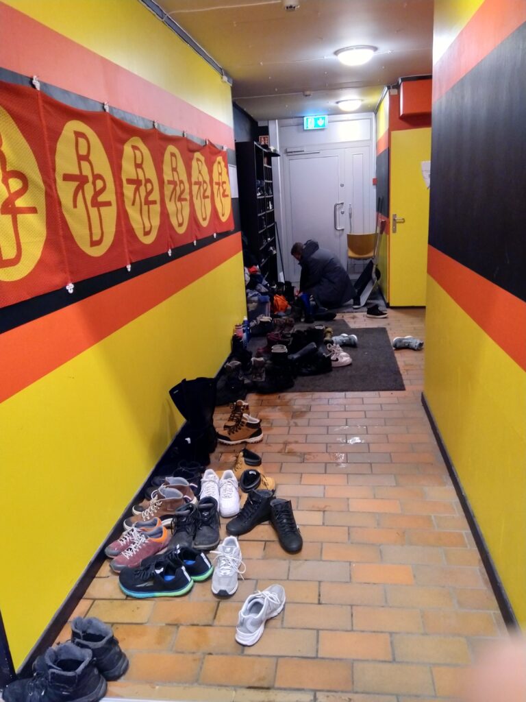 Revenons à nos moutons. Nous arrivons sur place et c’est la foule. Foule de chaussures dans l’entrée car oui on se déchausse pour éviter les flaques d’eau dans toute la salle, surtout en cette saison avec la neige, et foule de joueurs.