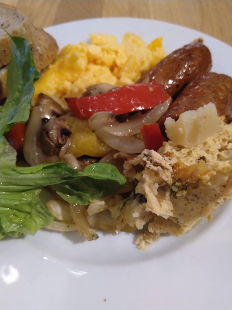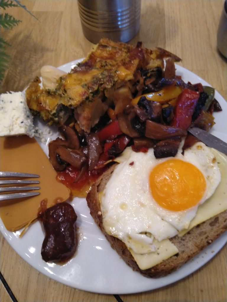 Au salé chaud, tu as le choix entre boulettes d’agneau, saucisses de différentes sortes, légumes sautés, haricots à la tomate, pommes de terres, bacon, oeufs en différentes façons : brouillés, omelettes, au plat, durs.