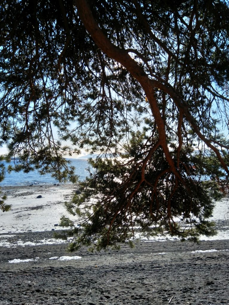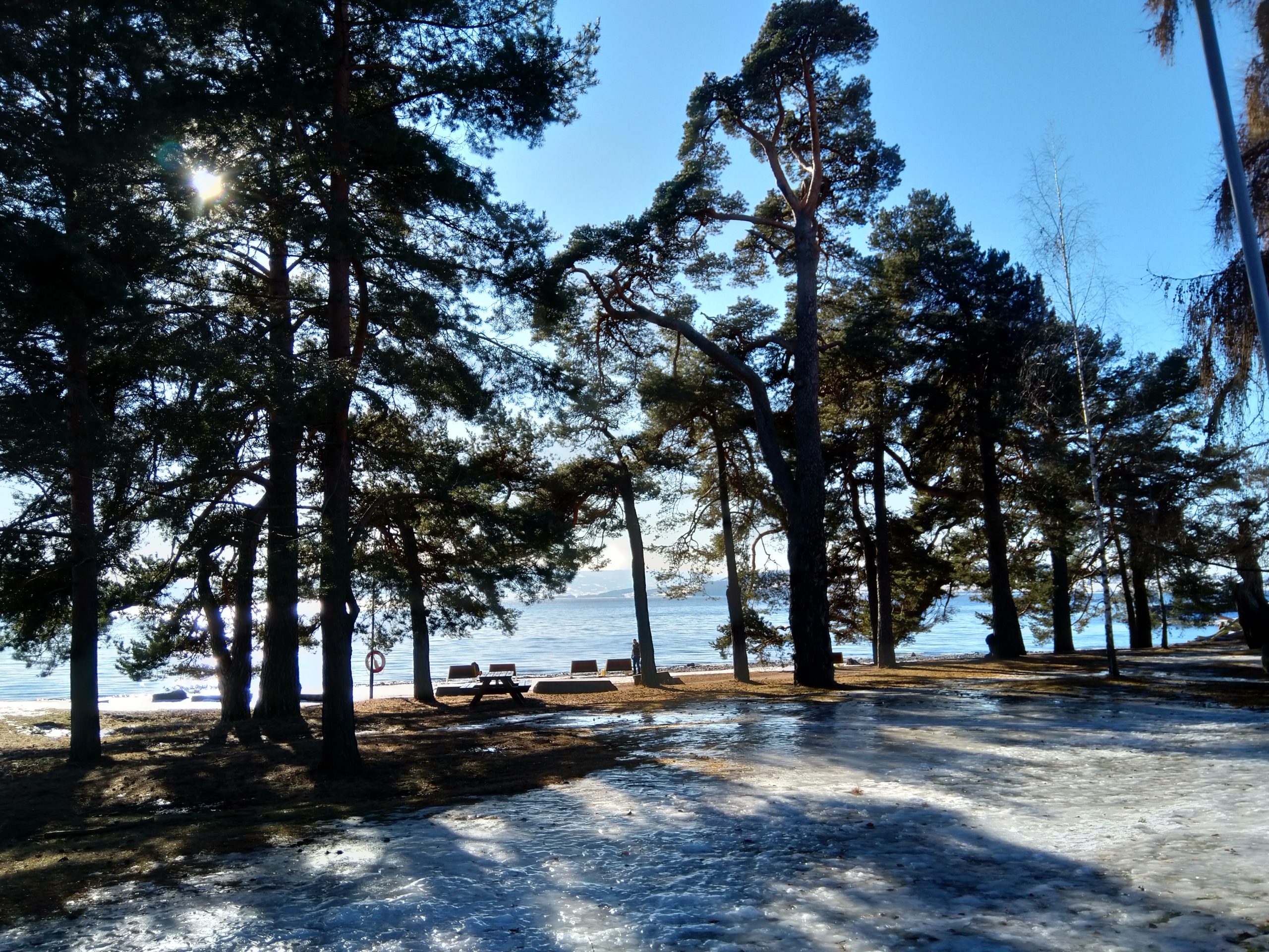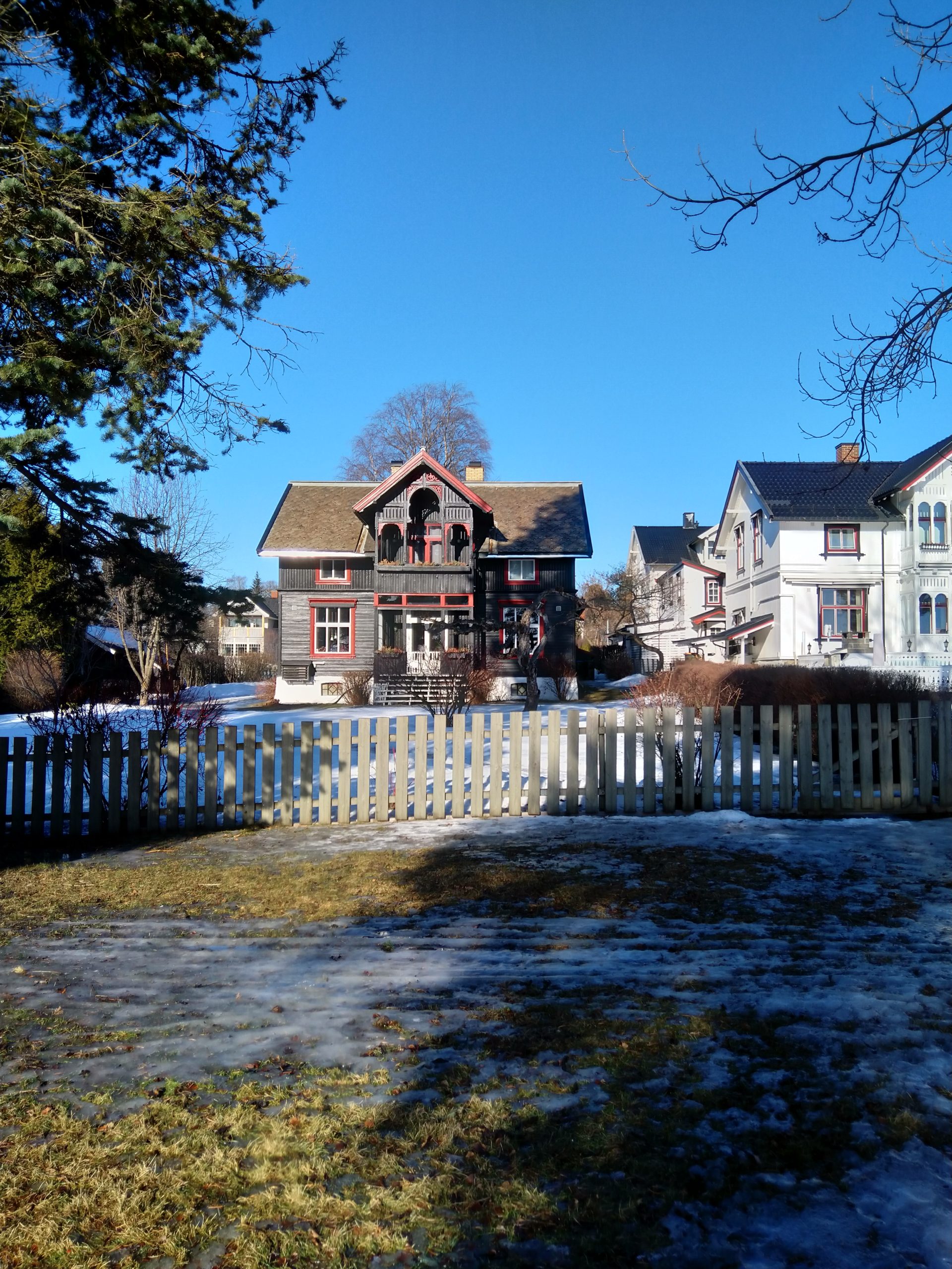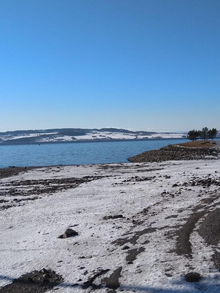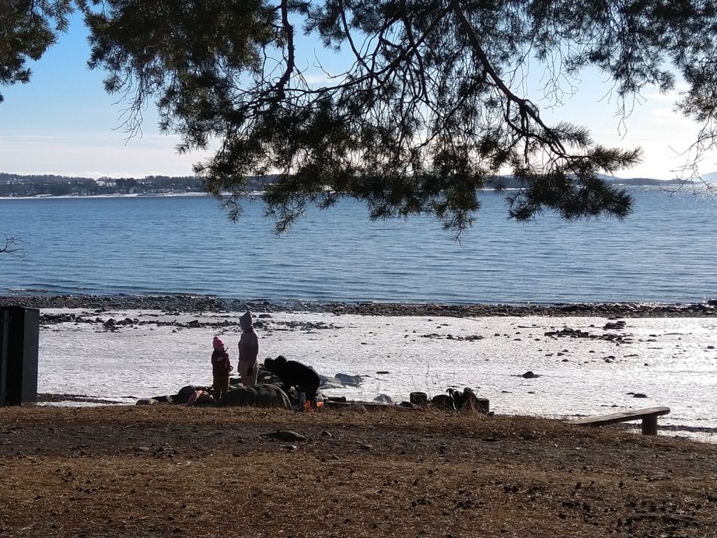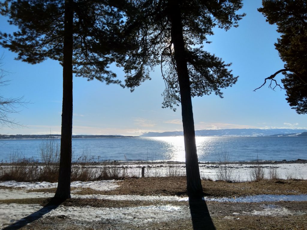 Hier, je me suis rendue à 1h de train en direction de Lillehammer dans une ville nommée Hamar afin d’avoir un rdv avec les impôts norvégiens. C’est une ville située au bord d’un grand lac et qui est en pleine métamorphose. C’est à dire qu’il s’y construit de nombreux immeubles sur d’anciens sites industriels et que l’on sent que les industries qui ont permis à la ville d’évoluer ne sont plus là. Le rendez-vous avec les impôts s’est bien déroulé, il faut juste que je revienne dans un mois pour que toute la famille s’enregistre afin d’éviter des confusions en m’enregistrant moi d’abord puis les enfants…Du coup, si-tôt fini cet entrevue, j’ai entrepris d’aller me balader le long du lac. Il y avait un côté Riviera avec le soleil, les pins, le ciel et le lacs bleus. Ce n’était pas de l’écume sur la plage mais de la neige et sous la neige ce n’était pas du sable fin mais de bons gros cailloux. Les plages du Nord de la France avec leurs galets ont un côté plus accueillants que celles du lac dans le sens où les galets n’ont pas d’arêtes sur lesquelles se faire mal. Il y avait aussi un côté Biarritz avec de vieilles maisons en bois qui ont vu sur le lac. J’ai donc bien arpenté le rivage et grâce à mes grips je suis restée debout ! Il y a un musée qui abrite les restes d’une cathédrale médiévale. Il était fermé, du coup, nous y retournerons peut-être aux beaux jours.