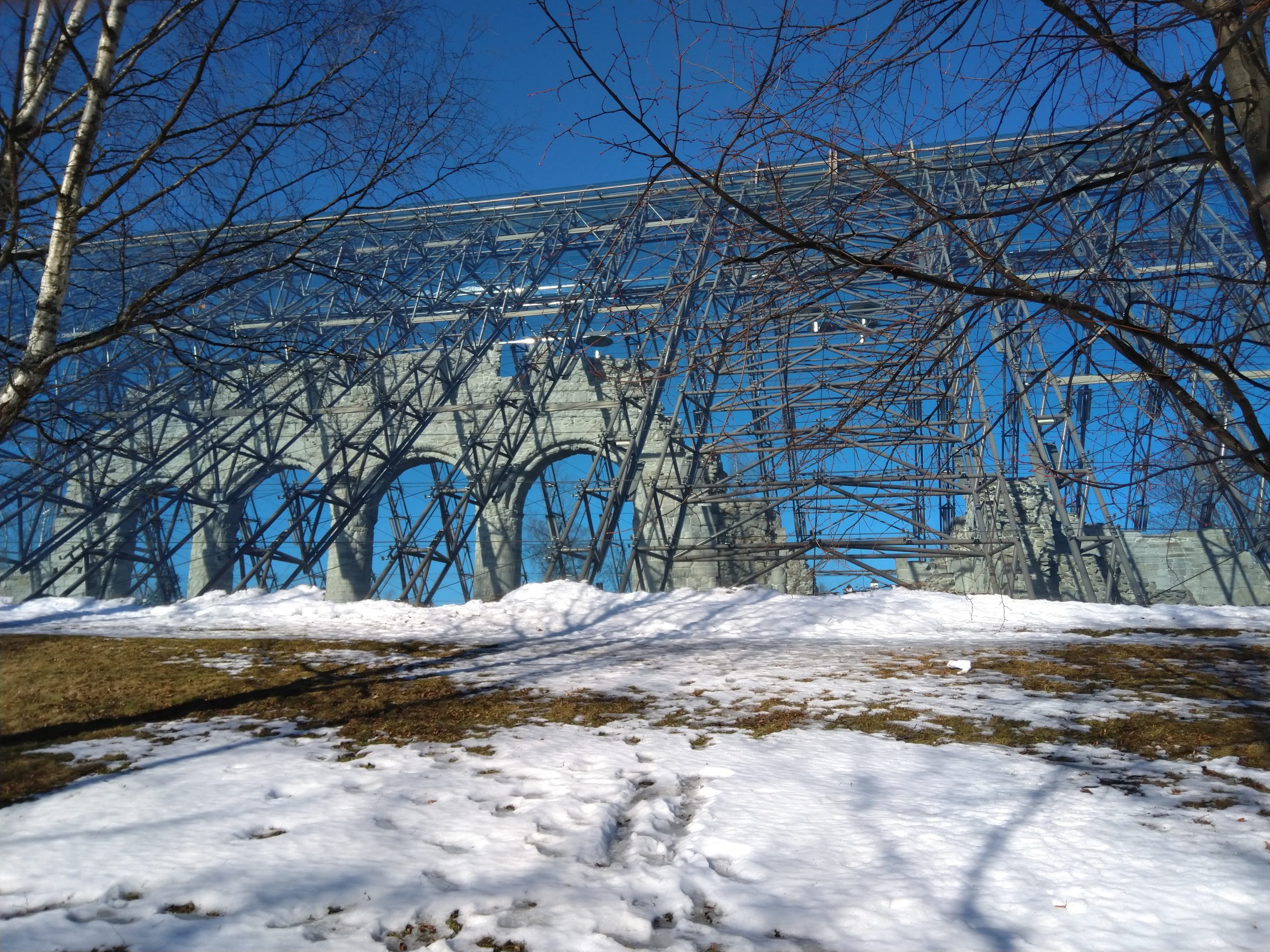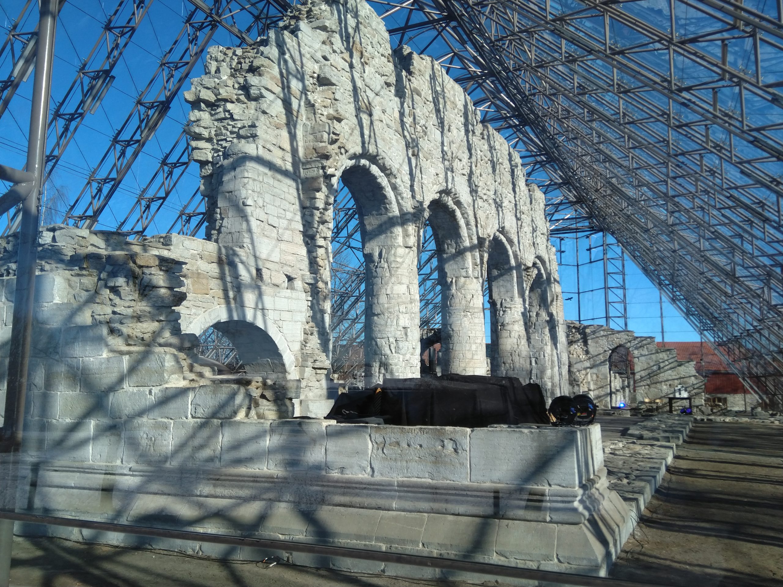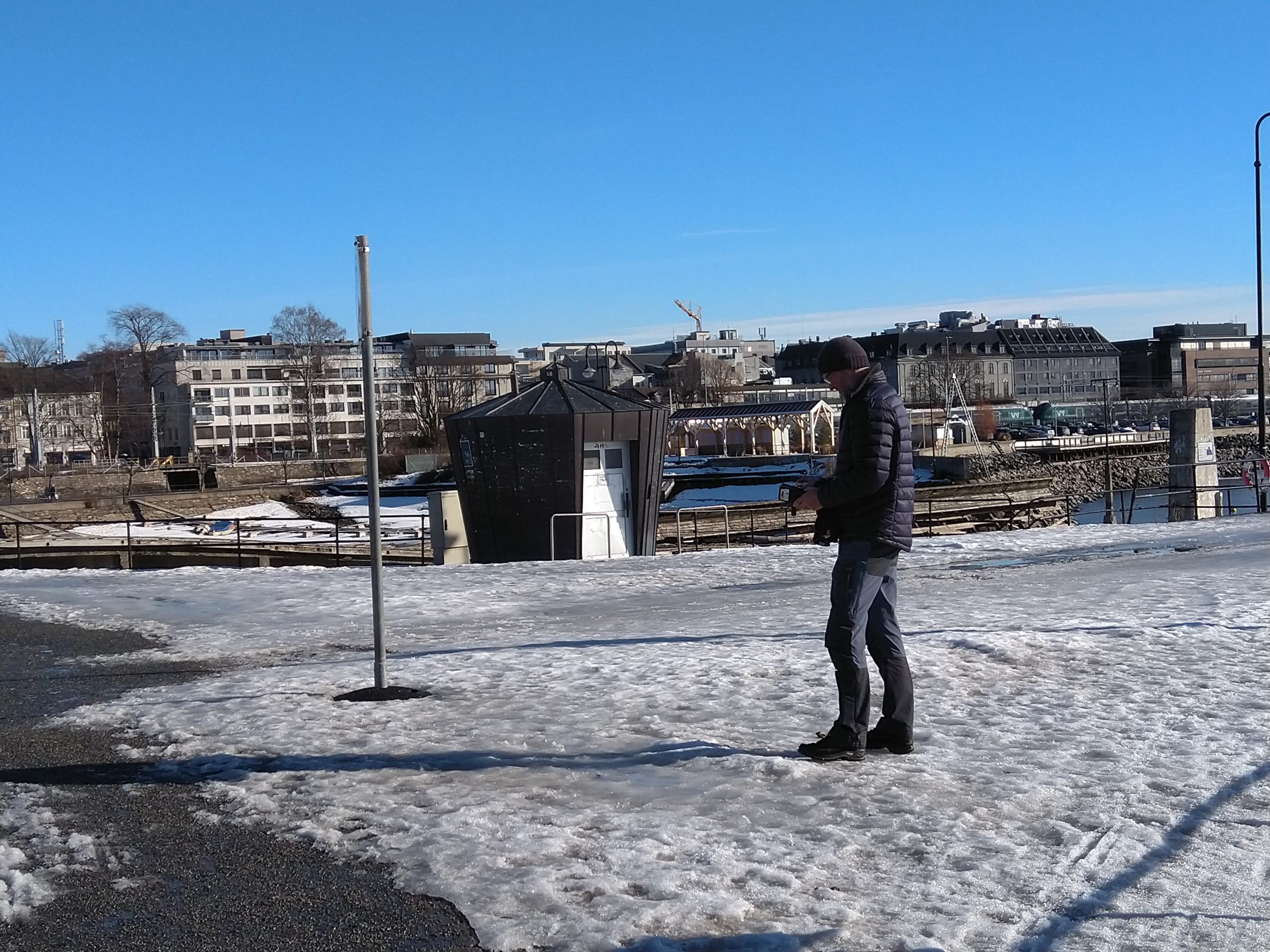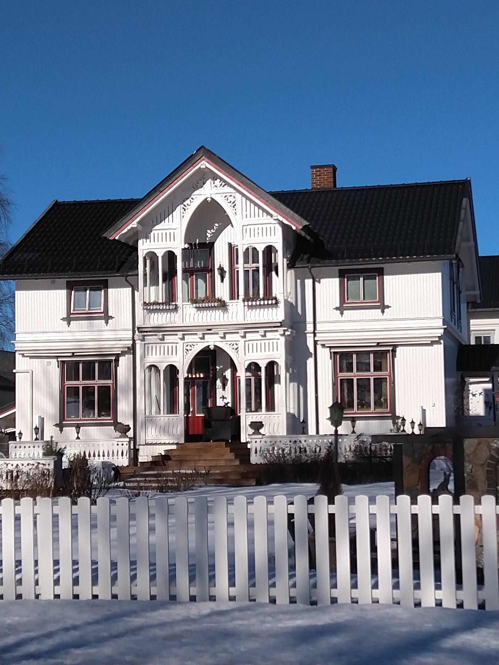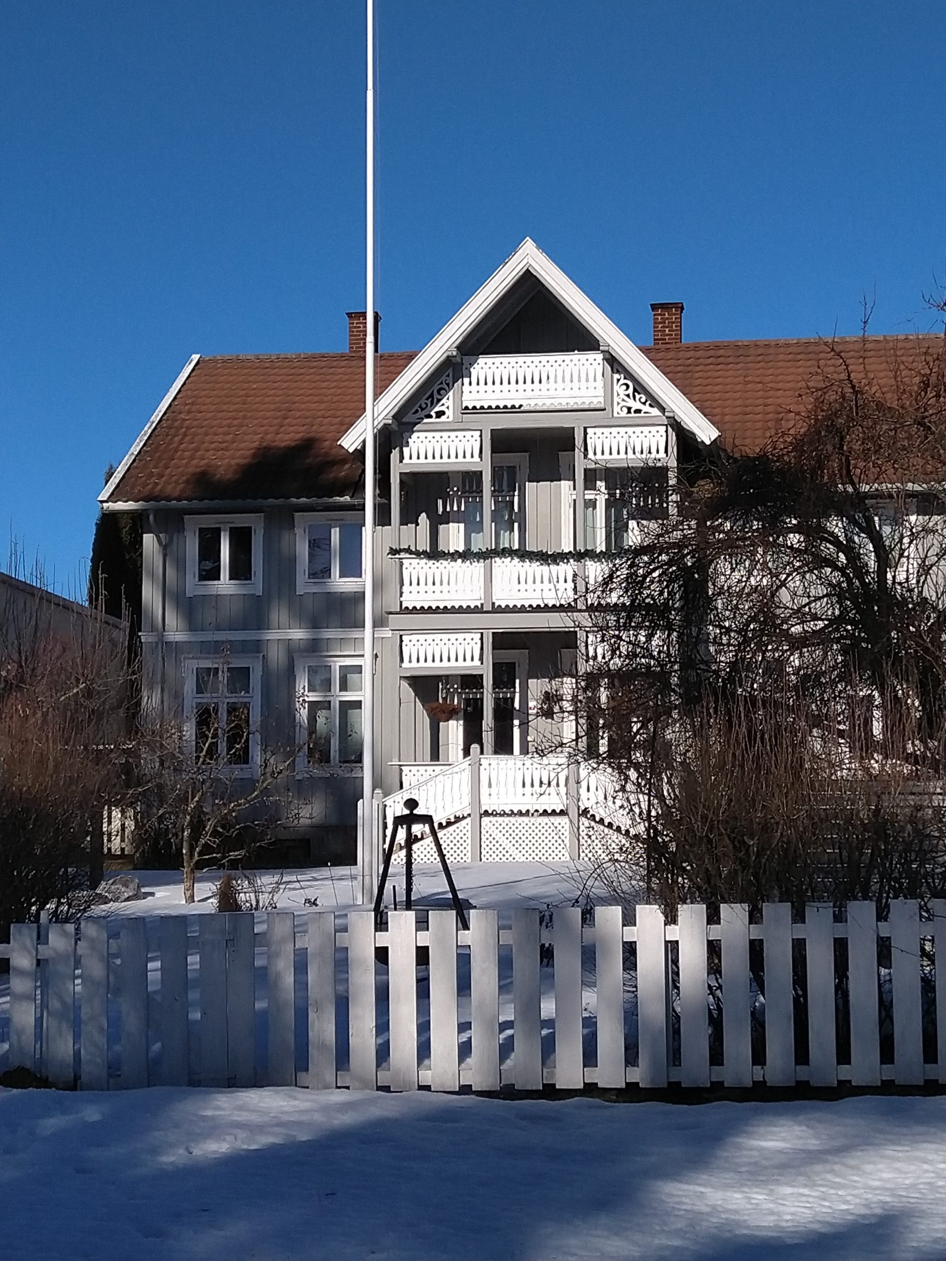 Hier, je me suis rendue à 1h de train en direction de Lillehammer dans une ville nommée Hamar afin d’avoir un rdv avec les impôts norvégiens. C’est une ville située au bord d’un grand lac et qui est en pleine métamorphose. C’est à dire qu’il s’y construit de nombreux immeubles sur d’anciens sites industriels et que l’on sent que les industries qui ont permis à la ville d’évoluer ne sont plus là. Le rendez-vous avec les impôts s’est bien déroulé, il faut juste que je revienne dans un mois pour que toute la famille s’enregistre afin d’éviter des confusions en m’enregistrant moi d’abord puis les enfants…Du coup, si-tôt fini cet entrevue, j’ai entrepris d’aller me balader le long du lac. Il y avait un côté Riviera avec le soleil, les pins, le ciel et le lacs bleus. Ce n’était pas de l’écume sur la plage mais de la neige et sous la neige ce n’était pas du sable fin mais de bons gros cailloux. Les plages du Nord de la France avec leurs galets ont un côté plus accueillants que celles du lac dans le sens où les galets n’ont pas d’arêtes sur lesquelles se faire mal. Il y avait aussi un côté Biarritz avec de vieilles maisons en bois qui ont vu sur le lac. J’ai donc bien arpenté le rivage et grâce à mes grips je suis restée debout ! Il y a un musée qui abrite les restes d’une cathédrale médiévale. Il était fermé, du coup, nous y retournerons peut-être aux beaux jours.