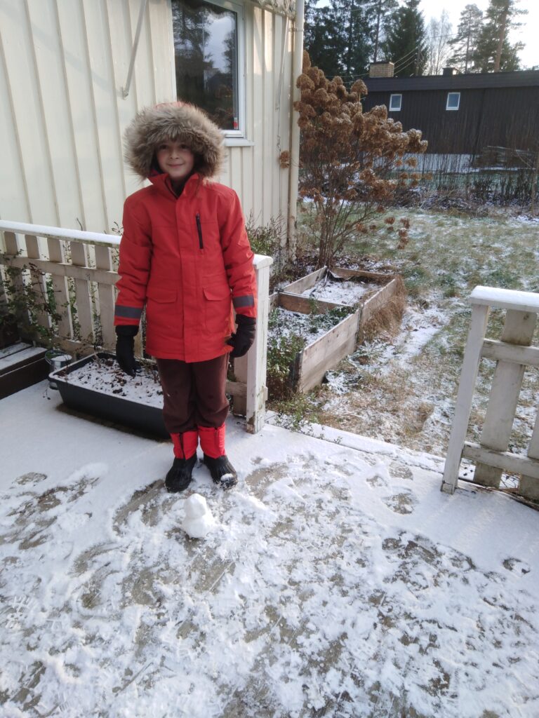 Snø Ça y est, la neige arrive. Une fine couche pour l’instant, mais Aléna est quand même parvenue à réaliser un gigantesque bonhomme de neige.