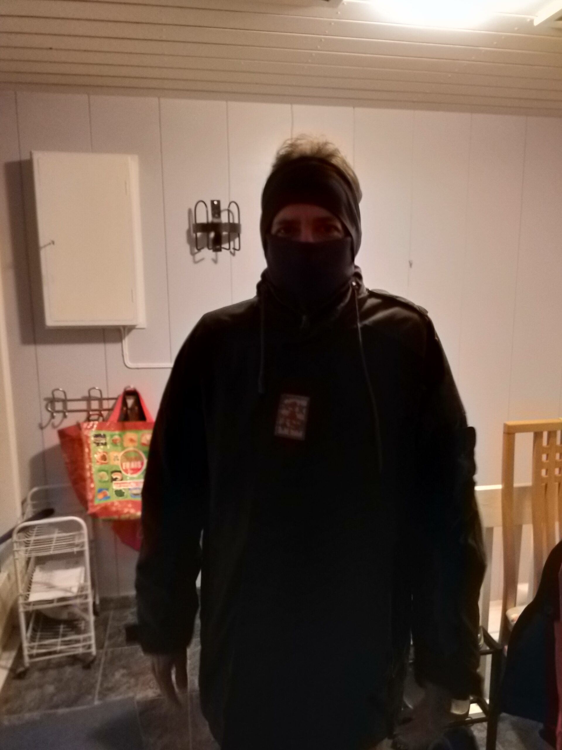 Le dernier modèle est la tenue anti-froid de Loïc, qu’il porte pour faire du vélo ces derniers temps. Peu de parties corporelles restent exposées aux éléments. Le hic est la condensation qui se forme sur ses lunettes quand il passe de l’extérieur à l’intérieur. Il a investi dans un cache-oreilles et un cache-col pour compléter ce qu’il avait déjà, et bien sûr ces « caches-… » sont doux au toucher, ne grattent pas, le serre suffisamment mais pas trop…