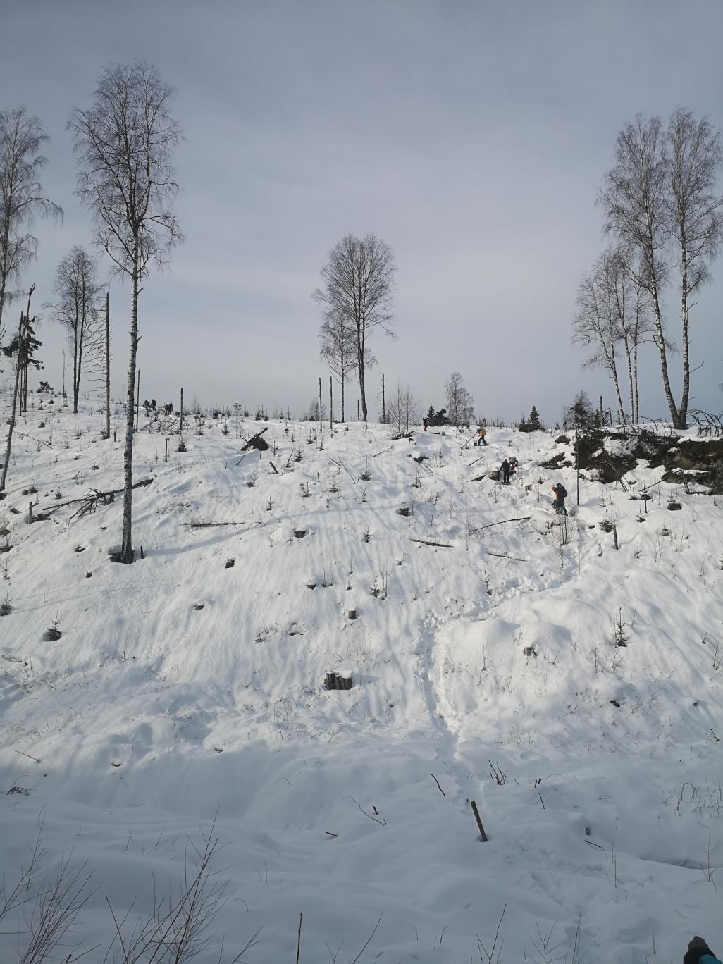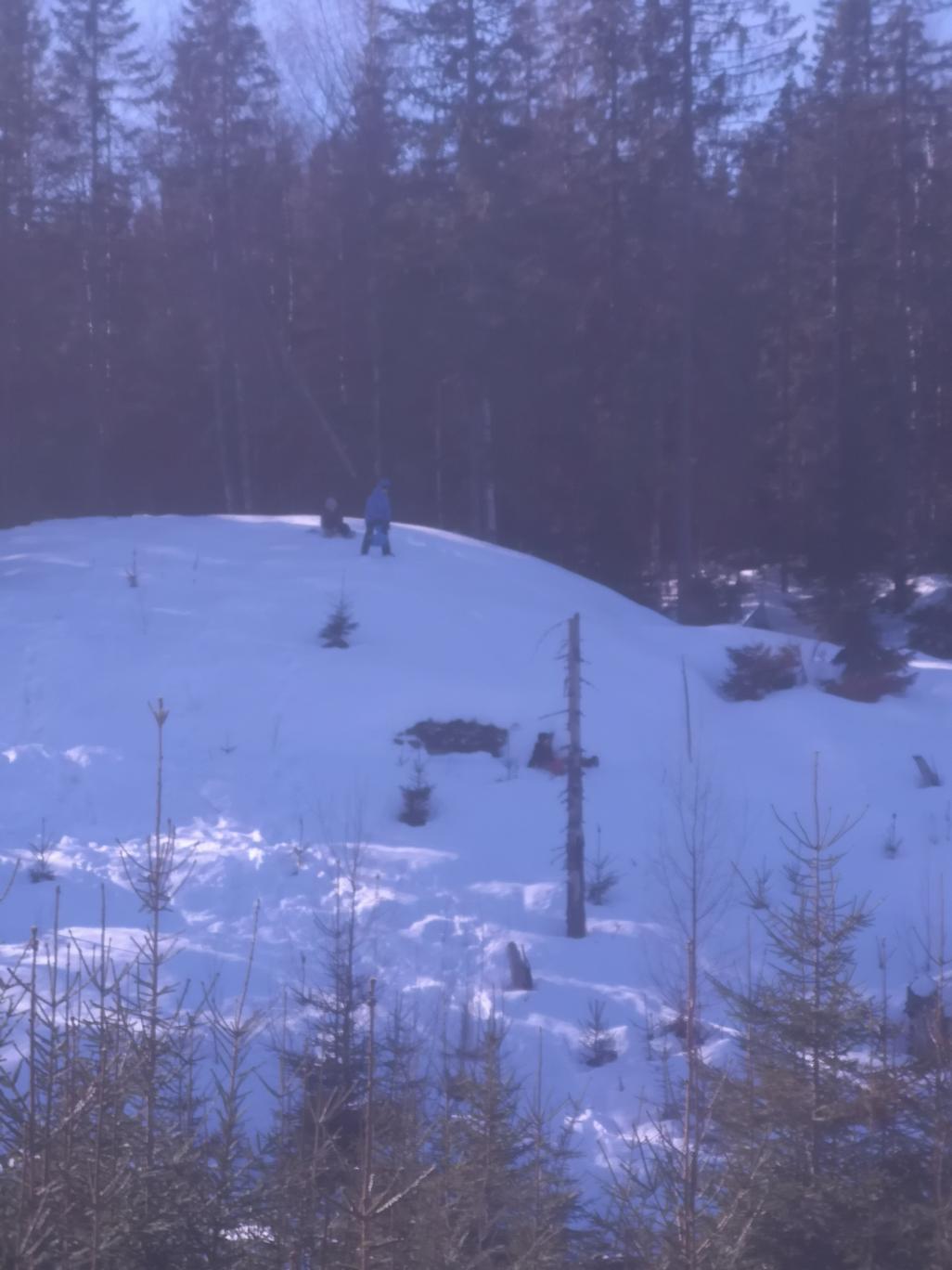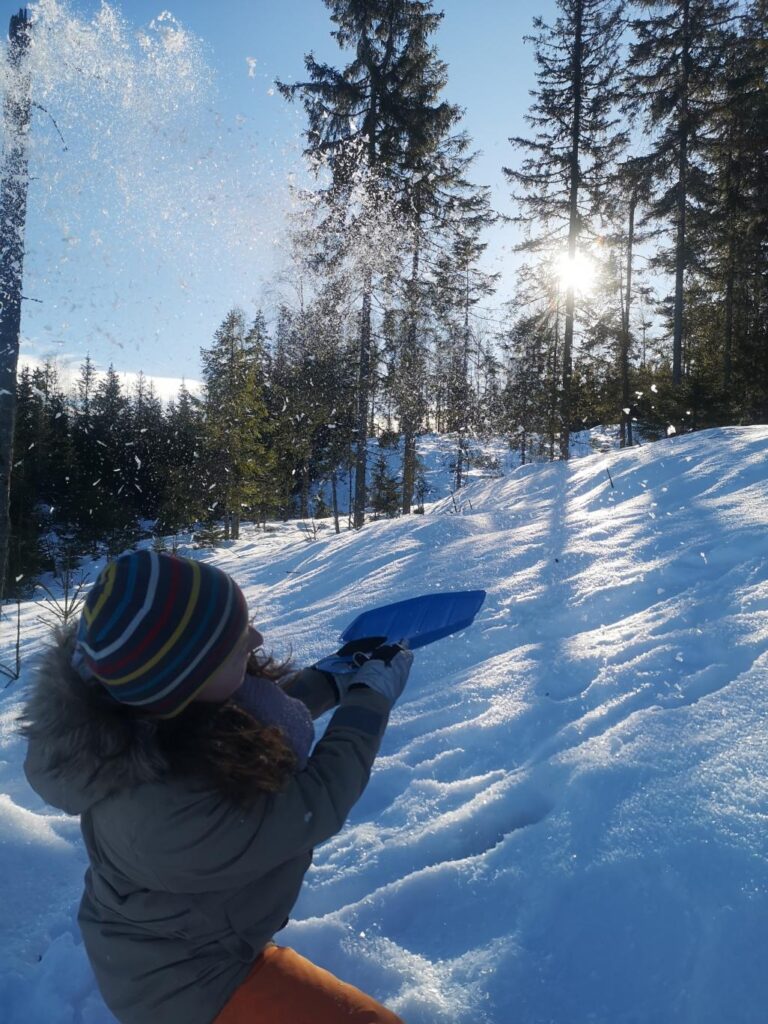 Après, ils ont fait de la luge. À un moment, Aléna a réussi à coincer son pied sous une racine cachée sous la neige. Il a fallu la soulever pour la sortir de là, mais la chaussure n’est pas venue avec elle. Heureusement, ils ont réussi à récupérer la chaussure, elle n’a pas fini la journée en chaussette !