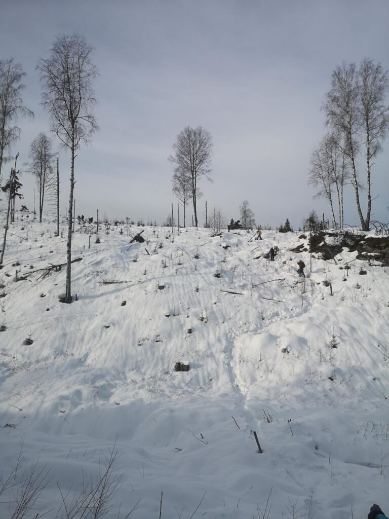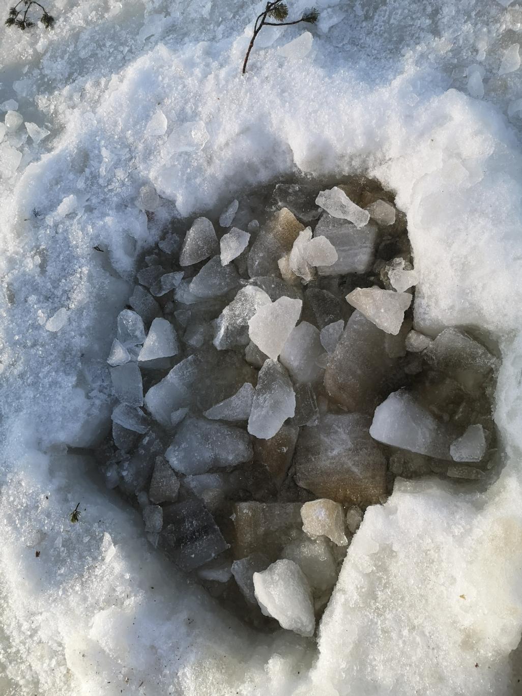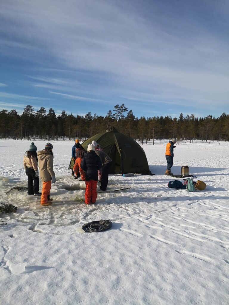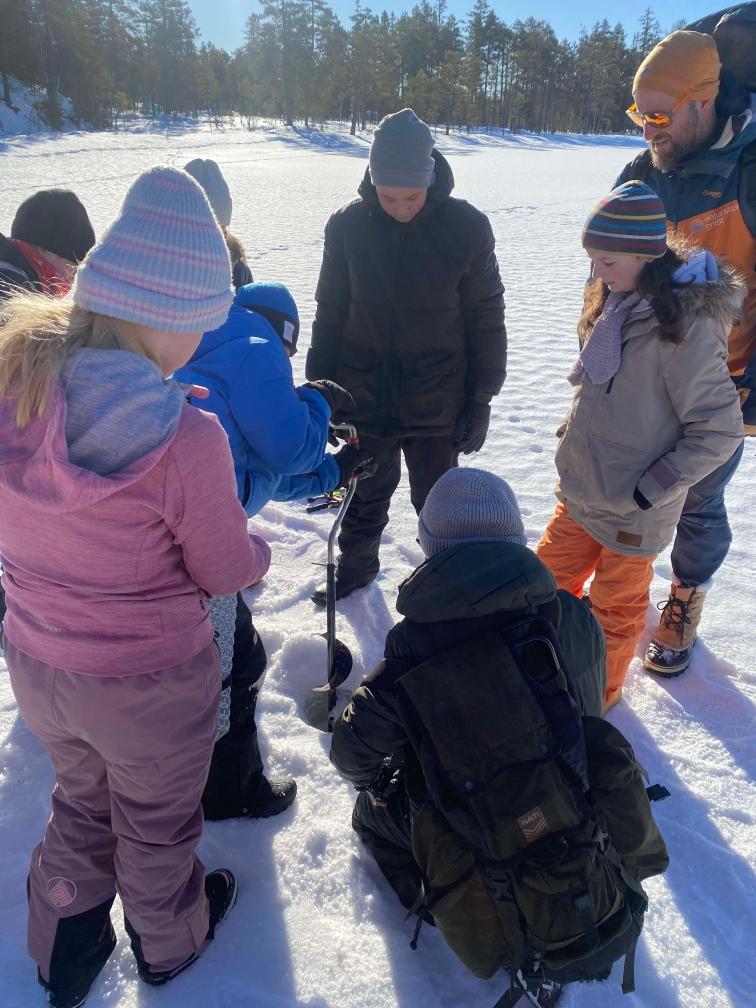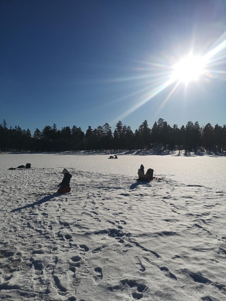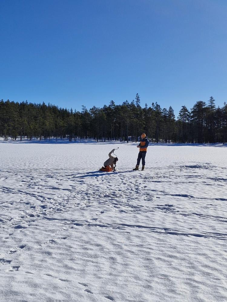 Ils ont commencé à faire un trou dans la glace pour pouvoir pêcher. Aléna a été impressionnée par l’épaisseur de glace. La pêche ne fut guère fructueuse : zéro poisson, malgré tous les trous et les pêcheurs.
