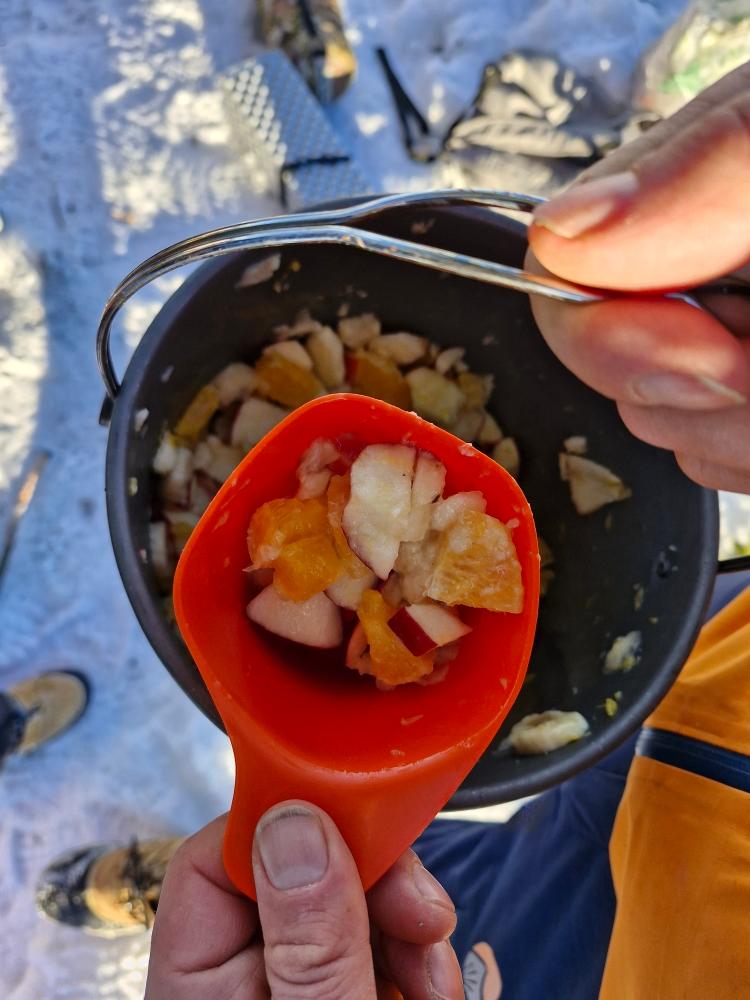 Enfin, après l’effort, le réconfort : de la soupe (qu’elle a aimé !), une salade de fruits avec sauce à la vanille et un chocolat chaud.